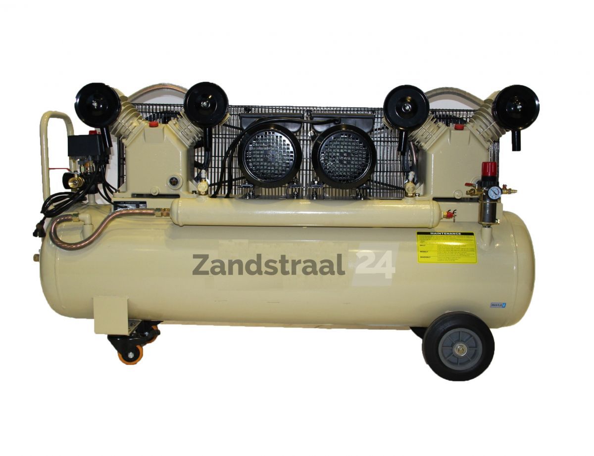 Dieser Kompressor hat einen 150-Liter-Tank. Mit einem Arbeitsdruck von 10 bar ist dieser leistungsstarke Kompressor die ultimative Lösung für alle Arbeiten, die mit einer hohen Luftleistung ausgeführt werden müssen.Geeignet zum Sandstrahlen oder Perlstrahlen (auch in einer Sandstrahlkabine), ausgestattet mit einer Sandstrahlpistole mit Düse bis 4 mm, zum Reinigen von Holz und Möbeln, Entrosten und Reinigen kleinerer Flächen. Dieser Kompressor ist der ideale Sandstrahlkompressor für private und professionelle Anwender. Mit Zwischenpuffer gegen Spannungsspitzen, Druckregler und Sicherheitsgruppe. Die Pumpen (900tpm) können getrennt voneinander gestartet werden.
