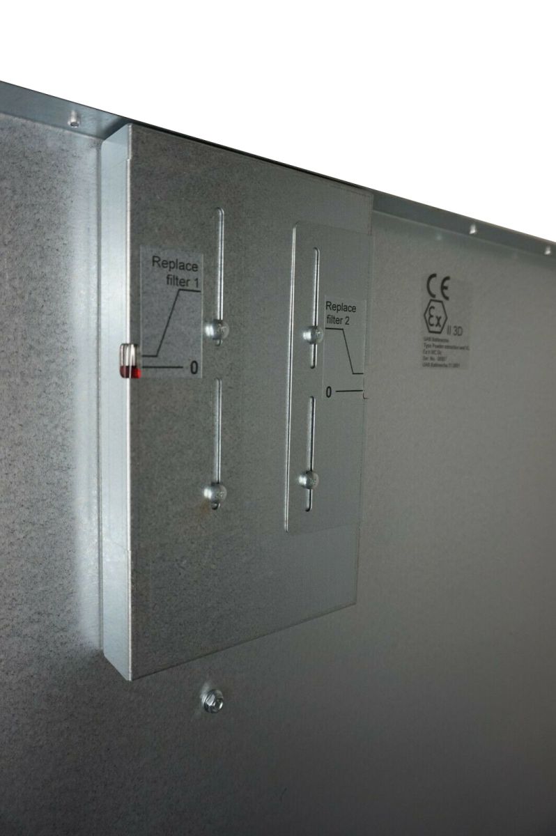 Integrated filter indicators let you know when to change filters. The blanket filter measuring 163x66cm lasts about 5 kg of powder and costs €8 including VAT. The filter price works out at just €0.20 per car wheel. There are also two bag filters behind the blanket filter that need to be replaced every 125 kg of atomised powder. We can supply both blanket and bag filters.