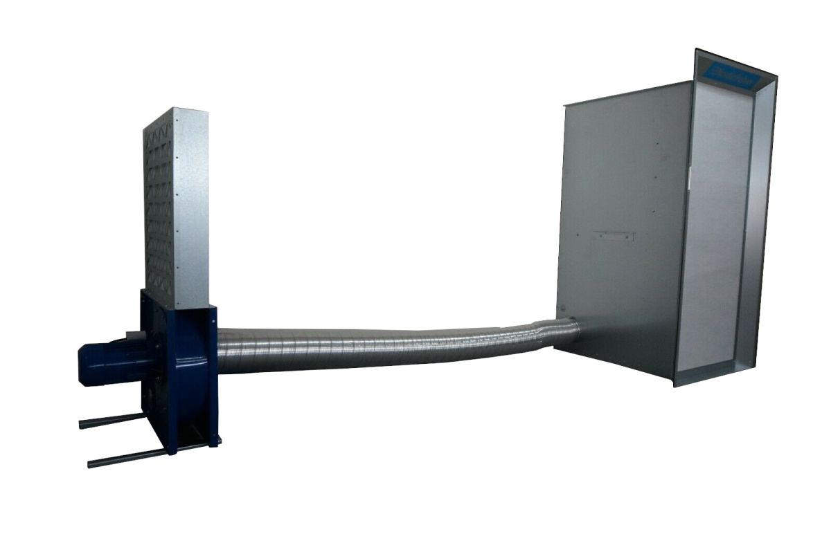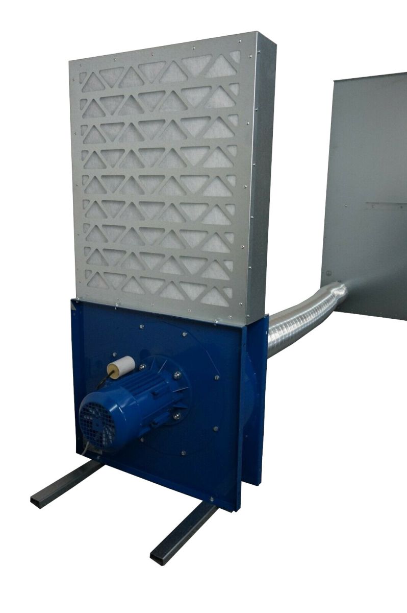 Un ventilateur d'une capacité de 1500 m3/h est inclus. Le moteur monophasé fonctionne sur 400 V (1100W) et peut donc être utilisé dans n'importe quel atelier. Le ventilateur doit être placé à au moins 3 mètres du mur d'extraction et de préférence dans une pièce séparée afin que l'air ne puisse pas circuler. Le ventilateur doit être raccordé à un mur d'extraction par le biais de la gaine fournie.